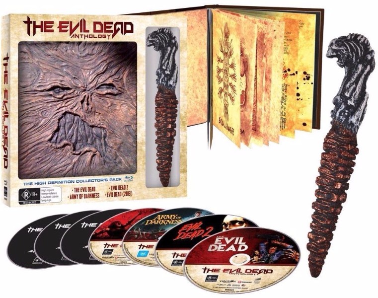 For the first time in the world, all 4 Fantastic Evil Dead Films includein the 1978 Evil dead, Evil Dead 2, Army of Darkness and Evil Dead 2013, This collectable pack also features The Necronomicon Outer, 16 pages of original drawings and a 23 cm replica prop Dagger from Evil Dead 2 PLUS Heaps of bonus features and the Premiere of the documentary Invaluable.