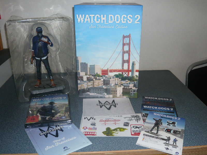 - eine doppelseitige Karte von San Francisco, gekennzeichnet mit allen spielinternen Hotspots wie DedSec-Hauptquartier, Gang-Territorien, verschiedene Shops und interessante Plätze