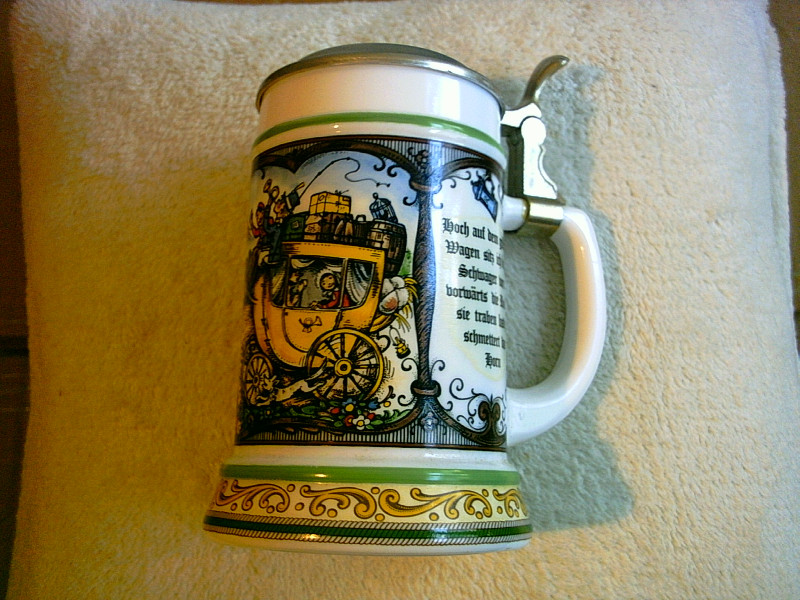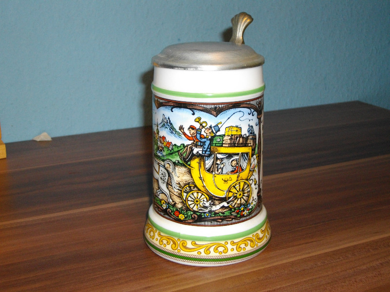Ich verkaufe hie einen Bierkrug von BMF, mit Deckel, Motiv Postillion, im guten Zustand.