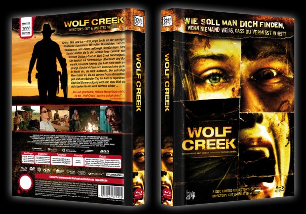 | Extras: | Disc 1 (Director''s Cut & Unrated Version) (BD-50) + Audiokommentar von Greg McLean, Matt Hearn, Cassandra Magrath & Kestie Morat (Ton: eng.; UT: dt.) + Making Of (49:44 Min.) + Geschnittene Szenen (6:00 Min.) (Ton: eng.; UT: dt.) + TV Spots (1:04 Min.) (eng.) + Trailer - Deutsch (2:08 Min.) - Englisch (1:41 Min.) + Wolf Creek 2 - Trailer (1:51 Min.) (dt.) + Father''s Day - Trailer (2:30 Min.) (dt.) Disc 2 (Unrated Version) (DVD-8,5 GB) + Keine Extras Disc 3 (Director''s Cut) (DVD-8,5 GB) + Fotogalerie (3:11 Min.) (Slideshow) + Weitere Highlights - Mr. & Mrs. Smith (0:38 Min.) (dt.) - Tristan & Isolde (2:20 Min.) (dt.) - Saw I & II (Steel Edition) (0:54 Min.) (dt.) - Pulse (0:50 Min.) (dt.) - Spartan (1:59 Min.) (dt.) - The Fountain (2:17 Min.) (eng.) - Chaos (1:44 Min.) (dt.) + 3 Trailer vor dem Hauptmenü - Deutschland - Ein Sommermärchen (2:11 Min.) (dt.) - See No Evil (0:31 Min.) (dt.) - Saw III (1:07 Min.) (dt.) (Alle anderen Extras sind mit Disc 1 identisch) |