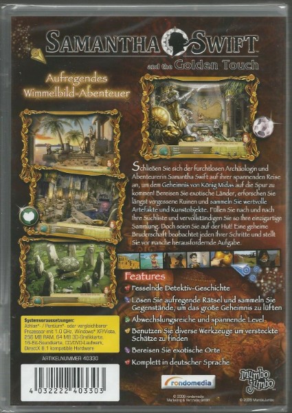 | Schließen Sie sich der furchtlosen Archäologin und Abenteurerin Samantha Swift auf ihrer spannenden Reise an, um dem goldenen Geheimnis von König Midas auf die Spur zu kommen! Bereisen Sie einzigartige Länder und erforschen Sie längst vergessene Ruinen und sammeln Sie so wertvolle Artefakte und Kunstobjekte. |