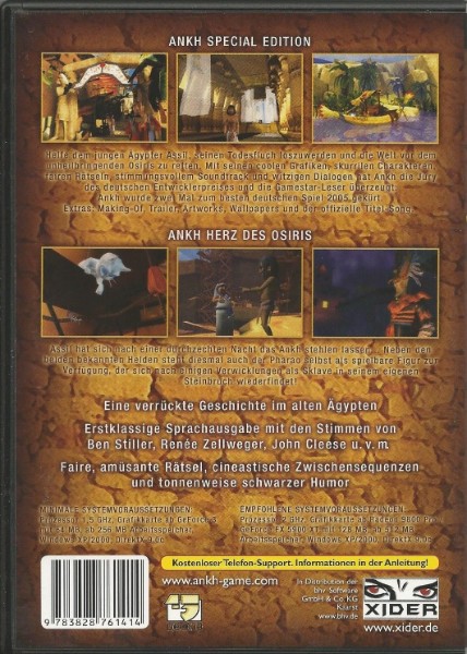 Helfe dem jungen Ägypter Assil, seinen Todesfluch loszuwerden und die Welt vor dem unheilbringenden Osiris zu retten. Mit seinen coolen Grafiken, skurrilen Charakteren, fairen Rätseln, stimmungsvollem Soundtrack und witzigen Dialogen hat Ankh die Jury des deutschen Entwicklerpreises und die Gamestar-Leser überzeugt: Ankh wurde zwei Mal zum besten deutschen Spiel 2005 gekürt. Extras: Making-Of, Trailer, Artworks, Wallpapers und der offizielle Titel-Song. Assil hat sich nach einer durchzechten Nacht das Ankh stehlen lassen... Neben den beiden bekannten Helden steht diesmal auch der Pharao selbst als spielbare Figur zur Verfügung, der sich nach einigen Verwicklungen als Sklave in seinem eigenen Steinbruch wiederfindet!