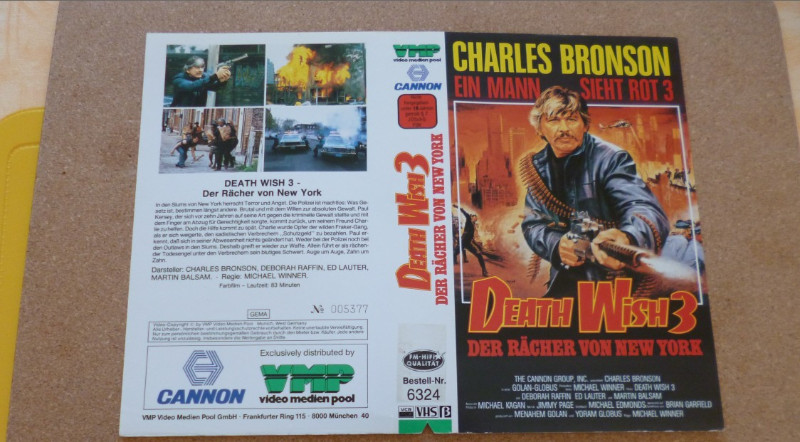 Death Wish 3 - Der Rächer von New York: Tauchen Sie ein in die actiongeladene Welt von Charles Bronson mit diesem packenden VHS-Film. In diesem dritten Teil der berühmten "Death Wish"-Reihe kehrt Bronson als Paul Kersey in die Straßen New Yorks zurück, um das Gesetz in die eigenen Hände zu nehmen. Die grandiose Regie von Michael Winner und die atemberaubende Darbietung von Bronson machen diesen Film zu einem absoluten Muss für jeden Actionfilm-Liebhaber. Der Film, vertrieben durch Cannon und exklusiv distribuiert von VMP Video Medien Pool, bringt das aufregende 80er-Jahre-Feeling direkt in Ihr Wohnzimmer zurück! Diese originalgetreue VHS-Kassette ist ein wahres Sammlerstück und perfekt für nostalgische Abende voller Spannung und Abenteuer.