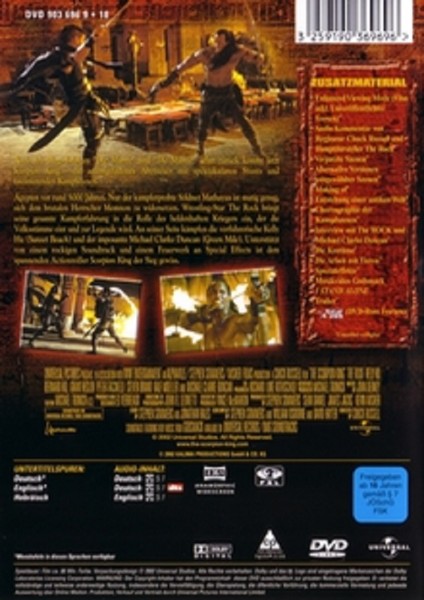 Tauchen Sie ein in eine Welt voller Abenteuer und Action mit der DVD von "The Scorpion King". Diese epische Geschichte erzählt vom legendären Krieger Mathayus, dargestellt von Dwayne 'The Rock' Johnson. Begleitet von beeindruckenden Spezialeffekten und einer fesselnden Handlung ist dieser Film ein Muss für alle Fans von Abenteuerfilmen.