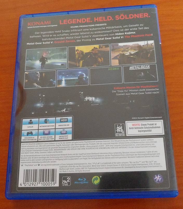 Englische Sprachausgabe, mehrsprachige Textausgabe: Metal Gear Solid V: Ground Zeroes fungiert als Prolog zu Metal Gear Solid V: The Phantom Pain und spielt ein Jahr nach den Geschehnissen von Metal Gear Solid: Peace Walker. Spieler übernehmen die Kontrolle des legendären Snake (a.k.a. Big Boss) und infiltrieren das kubanische Lager Camp Omega, wo Paz und Chico als Geiseln festgehalten werden. Diese sind im Besitz wichtiger Informationen, welche Snake und sein Vertrauter Kaz Miller für die Fortführung der eigenen, privaten Militärorganisation unbedingt geheim halten möchten. Ground Zeroes beinhaltet eine waghalsige Rettungsaktion, deren unvorhersehbaren Folgen die Ausgangsituation für ''''''''The Phantom Pain'''''''' bilden. Ground Zeroes führt zudem in die sehnlichst erwarteten Open-World Spielmechaniken ein und bildet somit den perfekten Brückenschlag zu früheren Titeln der Serie.