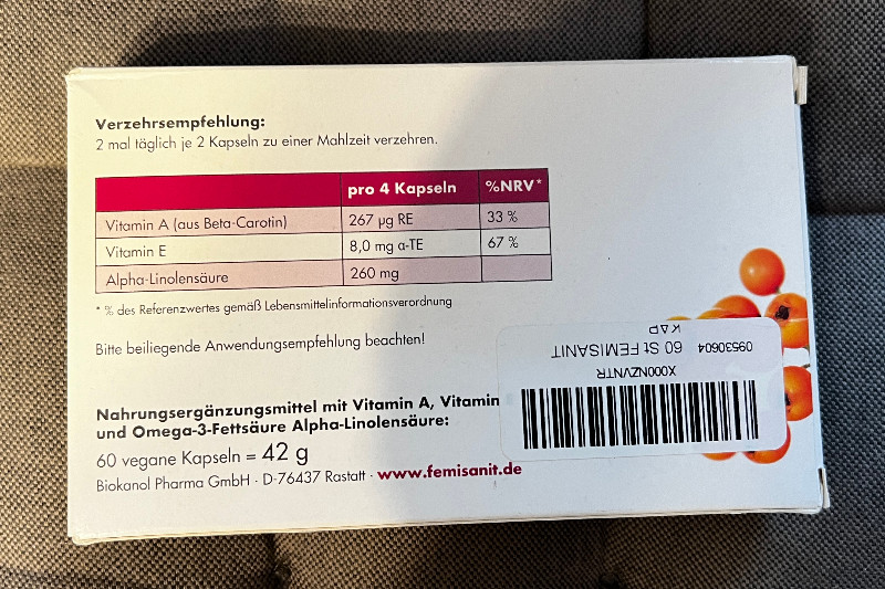 Verleihen Sie Ihrer Haut und Ihren Schleimhäuten die Pflege, die sie verdienen, mit den Femisanit Kapseln. Diese hochwertigen, veganen Nahrungsergänzungsmittel sind speziell entwickelt, um die Gesundheit und das Wohlbefinden Ihrer Haut und Schleimhäute zu unterstützen. Jede Packung enthält 60 Kapseln, die reich an Vitamin A sind - ein essentielles Vitamin für die Erhaltung normaler Haut und Schleimhäute. Mit regelmässiger Einnahme stärken Sie die natürliche Schutzbarriere Ihrer Haut und fördern gleichzeitig eine gesunde Schleimhautstruktur.