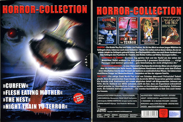 Die Box enthält die Filme: CURFEW, NIGHT TRAIN TO TERROR, FLESH EATING MOTHERS und THE NEST.
