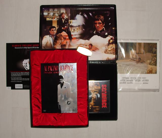 ich verkaufe hier die englische Scarface - Deluxe Gift Set - Collectors Edition mit 2 DVDs und allen Extras in einer wunderschönen Schlangenleder-Optik Box aus meiner Privatsammlung.