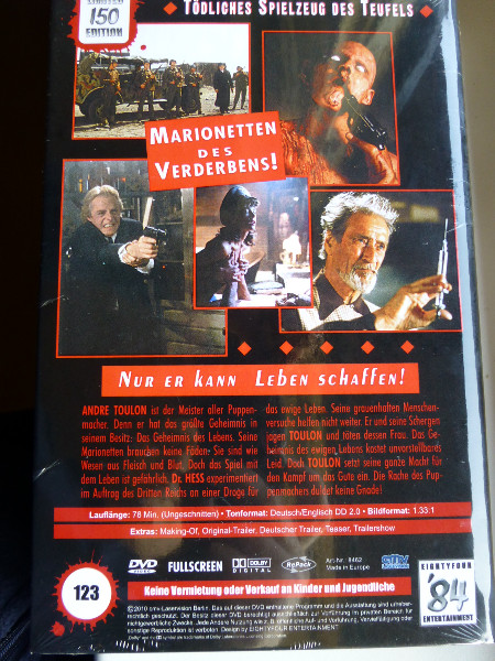 Extras: | Original Trailer (2:24 Min., engl.) Original Teaser (1:38 Min., engl.) Deutscher Trailer (1:50) Behind the Scenes (12:14 Min., engl. ohne UT) Trailer: Puppet Master (1:36 Min., engl.), Puppet Master II (2:15 Min., dt.) |