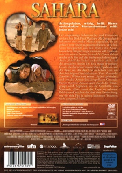Die DVD "Sahara - Abenteuer in der Wüste" beeindruckt nicht nur durch die packende Handlung und die großartigen Schauspieler, sondern auch durch die atemberaubenden Schauplätze und Spezialeffekte. Die spektakulären Aufnahmen der endlosen Wüstenlandschaft ziehen Sie in ihren Bann und lassen Sie die Hitze und das Abenteuer hautnah erleben.