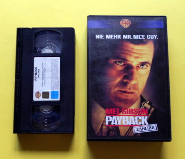 Entdecken Sie die Spannung und den Nervenkitzel, die "Payback - Zahltag" auf VHS bietet. Dieser packende Krimi-Thriller mit dem weltbekannten Schauspieler Mel Gibson in der Hauptrolle sorgt für Spannung von der ersten bis zur letzten Minute. Auf dem Cover prangt ein intensiv blickender Mel Gibson, was die düstere und ernste Atmosphäre des Films unterstreicht.