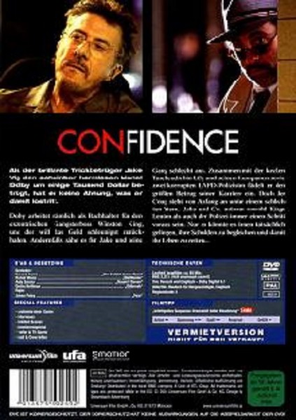 „Confidence“ ist ein fesselnder Krimi/Thriller, der mit einer beeindruckenden Besetzung aufwartet. Die Vermietversion dieser DVD verspricht Spannung pur, wie sie nur selten zu finden ist. Mit Dustin Hoffman in einer packenden Rolle, begleitet von herausragenden Leistungen von Edward Burns, Rachel Weisz und Andy Garcia, erleben Sie ein meisterhaft inszeniertes Katz-und-Maus-Spiel. Die Handlung dreht sich um einen genialen Betrüger, der versucht, das perfekte Verbrechen zu begehen, und dabei auf unerwartete Hindernisse stößt. Lassen Sie sich von der raffinierten Geschichte und dem mitreißenden Spiel der Darsteller in den Bann ziehen und genießen Sie hochwertige Unterhaltung auf einer DVD, die in keiner Sammlung fehlen darf.