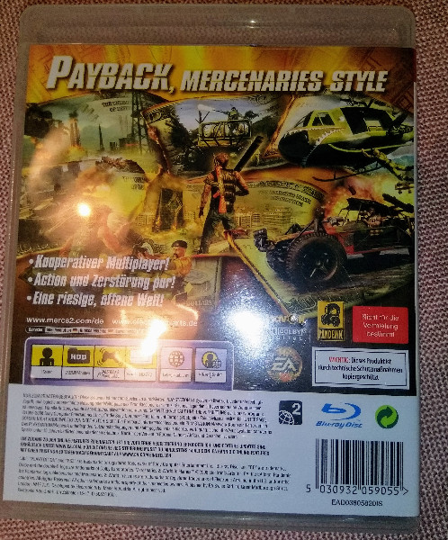 Mercenaries 2 World in Flames ist ein explosives Actionspiel, das in einer riesigen offenen und hochgradig reagierenden Welt spielt - einer vom Krieg zerrissenen Welt. Ein machthungriger Tyrann greift nach der Ölversorgung Venezuelas und löst damit eine Invasion aus, die das Land in ein Kriegsgebiet verwandelt. Für dich allerdings bedeutet die internationale Krise eine goldene Zeit: Du bist ein Söldner, und du profitierst vom Chaos. In Mercenaries 2 gibt es eine Menge potenzieller Kunden, die heiß darauf sind, dich zu bezahlen, damit du ihre dreckige Arbeit machst. Dreckige Jobs zu unverschämt hohen Preisen. Mercenaries 2 bietet die neuesten und gefährlichsten zivilen und militärischen Technologien, vom coolen neuen Sportwagen bis hin zur futuristischen, satelliten-gesteuerten, bunkerbrechenden Mini-Bombe. Panzer, Transportfahrzeuge, Luxusautos Boote - wenn du etwas haben willst, dann wird es dir in Echtzeit geliefert. Und wenn du knapp bei Kasse bist, kannst du dir die Ausrüstung, die du brauchst, immer auch auf dem Schlachtfeld ''''''''''''''''''''''''''''''''''''''''''''''''''''''''''''''''aneignen''''''''''''''''''''''''''''''''''''''''''''''''''''''''''''''''. Wenn du etwas siehst, kannst du es kaufen, stehlen oder in die Luft jagen. Geh deinen eigenen Weg oder spiel mit einem Freund im neuen kooperativen Multiplayermodus. Du bist kein Soldat. Du musst nicht nach den Regeln der Anderen spielen. Du hast deinen eigenen Kodex: Du wirst deinen Vertrag erfüllen, egal wie. Allerdings ist nicht jeder in der Welt von Mercenaries 2 so ehrenhaft. Jeder wird versuchen, dich reinzulegen, wenn er die Möglichkeit dazu hat. Und er wird glauben, er kommt damit durch - weil er Regel Nr. 1 nicht kennt: JEDER MUSS BEZAHLEN!