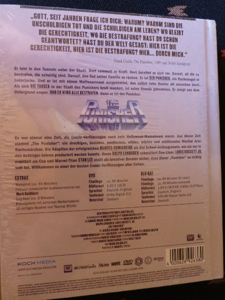 Bemerkungen: 16 Kapitel AVC codiert Dieses Mediabook enthält 3 Discs: # Disc 1 - Blu-ray mit dem Film in der R-rated und der Unrated-Version Laufzeit: Unrated: 89:16 Min. (84:52 Min. o. A*.) Kinofassung: 89:05 Min. (84:38 Min. o. A.*) # Disc 2 - DVD mit der Unrated-Version Laufzeit: 85:38 Min. (81:22 Min. o. A.*) Bildformat: 1,85:1 (anamorph) Tonformat: Deutsch und Englisch Dolby Digital 2.0 Untertitel: Deutsch * gemessen bis nach der Einblendung "The Punisher" # Disc 3 - DVD mit der Workprintversion in Englisch (DD 2.0) mit wahlweise deutschen Untertiteln. Bildformat ~1,71:1 (nicht anamorph). Am unteren Bildrand, nur minimal in das Bild ragend, steht während der gesamten Filmdauer "New World Pictures" |