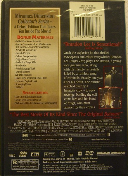 Greifen Sie jetzt zu und sichern Sie sich diese exklusive Ausgabe der "Miramax Dimension Collector's Series" von "The Crow" mit Brandon Lee. Tauchen Sie ein in ein unvergessliches Filmerlebnis und lassen Sie sich von der düsteren Schönheit dieses Kultklassikers verzaubern.