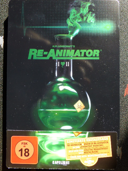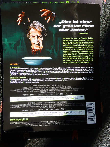 | Bemerkungen: Limitierte Erstauflage. Re-Animator & Bride of Re-Animator in der "Unrated" Fassung im 2-Disc-Steelbook. Bild und Ton Digital Remastered und restauriert. Der deutsche 2.0 Ton ist ein Upmix der original Mono-Tonspur. *Ab 85:49 Min. folgen Angaben zur Restauration. Das FSK-Logo befindet sich auf einem Papiereinleger, der nicht am Steelbook befestigt ist. Steelbook mit Innendruck. Dem Steelbook liegt ein 4-seitiges Booklet mit Werbung für weitere Capelight-Filme bei. AVC codiert. |