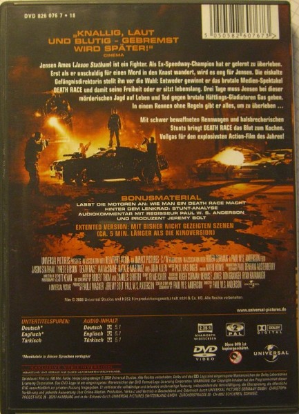 Erleben Sie die pure Action mit der Extended Version des aufregenden Adrenalinkicks "Death Race" mit Jason Statham in der Hauptrolle. Diese DVD entführt Sie in eine dystopische Zukunft, in der Häftlinge gezwungen sind, an brutalen Autorennen teilzunehmen, um ihre Freiheit zu erlangen. Die Extended Version bietet exklusive Szenen und intensivere Momente, die in der Kinofassung nicht gezeigt wurden. Mit atemberaubenden Stunts, explosiver Action und einer spannenden Story ist "Death Race" ein Muss für alle Action-Fans. Die hochwertige DVD-Version sorgt für ein optimales Filmerlebnis direkt in Ihrem Wohnzimmer. Diese Kategorie „DVD, Action” garantiert tiefgehende Unterhaltung und knisternde Spannung – perfekt für einen unvergesslichen Filmabend.