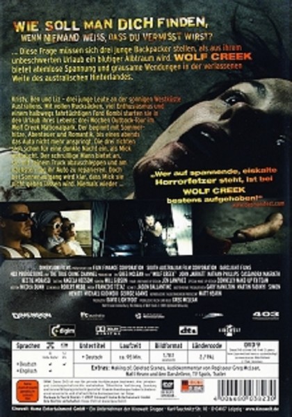 „Wolf Creek“ ist nicht nur ein Film, es ist eine Erfahrung, die Sie so schnell nicht vergessen werden. Der Film erzählt die Geschichte von zwei Rucksacktouristen, deren Abenteuer im australischen Outback zu einem albtraumhaften Erlebnis wird, als sie auf den mysteriösen Ivan treffen. Die Szenerie im entlegenen australischen Outback und die beklemmende Atmosphäre des Films sind perfekt eingefangen auf dieser DVD, welche eine hervorragende Bild- und Tonqualität bietet.
