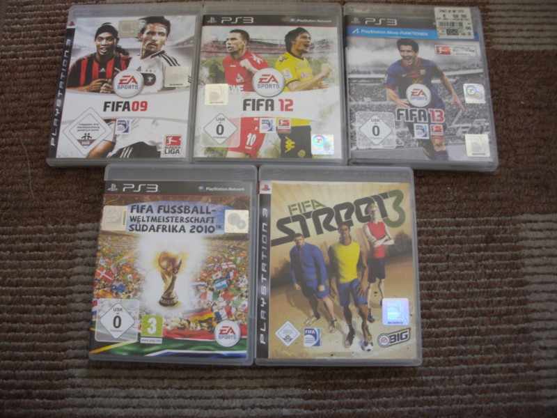 Verkaufe aus meiner Spielesammlung ein FIFA Bundle aus 5 Spielen für PS3 zum Komplettpreis. FIFA 09, FIFA 12, FIFA 13, FIFA Fußball WM 2010 Südafrika und FIFA Street 3. Alle CDs sind ohne Kratzer, alle Anleitungen dabei. Versand ins Ausland auf Anfrage möglich.