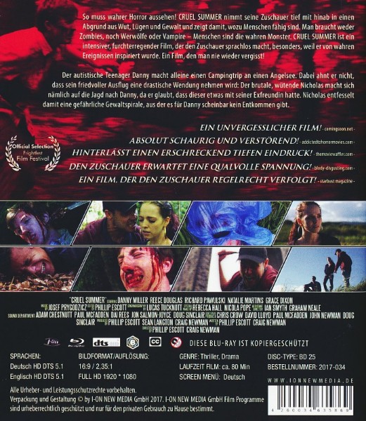 Erleben Sie "Cruel Summer" auf Blu-ray, einen Horrorfilm, der tief unter die Haut geht und mit packender Handlung überzeugt. Basierend auf einer wahren Geschichte, fesselt dieser Film von der ersten bis zur letzten Minute. Mit hochgelobten Kritiken von Dead Central und Bloody Disgusting und der Warnung "Geht unter die Haut und tut verdammt weh", bietet "Cruel Summer" intensiven Horrorgenuss. Die Blu-ray-Edition garantiert eine brillante Bildqualität und fesselnden Sound für ein unvergleichliches Heimkinoerlebnis. Bereiten Sie sich auf eine düstere und erschütternde Fahrt vor, die Ihre Sinne herausfordert und Ihre Nerven auf die Probe stellt.
