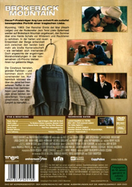 Erleben Sie eine der bewegendsten Liebesgeschichten des 21. Jahrhunderts mit der DVD-Ausgabe von "Brokeback Mountain". Dieses Drama, das drei Oscars gewonnen hat, zeigt die Meisterleistungen der Schauspieler Heath Ledger und Jake Gyllenhaal, die in den Hauptrollen brillieren. Unterstützt wird das talentierte Duo von weiteren herausragenden Darstellern wie Anne Hathaway und Michelle Williams.