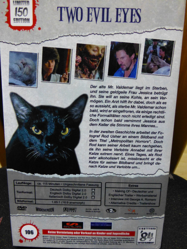 Tauchen Sie ein in die düstere Welt von "Two Evil Eyes", einem der faszinierendsten Horrorfilme aller Zeiten. Diese spezielle Große Hartbox-Edition bringt das Werk der legendären Regisseure George A. Romero und Dario Argento in Ihr Heimkino. Die Veröffentlichung punktet nicht nur mit hochwertiger Verpackung, sondern überzeugt auch durch eine brillante Bild- und Tonqualität. Der Film, besetzt mit Stars wie Harvey Keitel, Adrienne Barbeau, Ramy Zada und Madeleine Potter, ist ein unerlässliches Sammlerstück für jeden Gruselfilm-Fan.