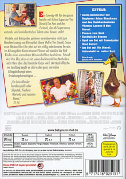 Entdecken Sie die Komödie "Der Babynator" mit dem Action-Star Vin Diesel in der Hauptrolle! Diese mitreißende DVD bringt Ihnen eine perfekte Mischung aus Action und Humor, die Ihre Lachmuskeln beanspruchen und Ihnen einen Abend voller Unterhaltung bescheren wird. In diesem Film nimmt Vin Diesel die Rolle eines toughen Navy SEAL an, der plötzlich eine ganz neue Art von Mission annehmen muss: das Babysitten. Mit viel Geschick und Humor stellt er sich den Herausforderungen des Vaterdaseins, was zu zahlreichen urkomischen Situationen führt. Dieser Film ist ein absolutes Muss für alle Fans von Komödien und Actionfilmen.