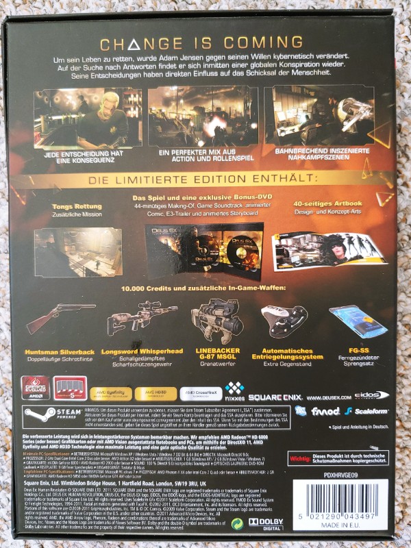 Mit der Limited Edition erhältst du exklusive Inhalte wie zusätzliche Missionen, hochwertige Konzeptzeichnungen und besondere Waffen, die im Standardspiel nicht verfügbar sind. Diese Extras machen das Spiel nicht nur abwechslungsreicher, sondern bieten dir auch einen strategischen Vorteil. Die hochwertige Box rundet das Gesamtpaket ab und ist ein Must-have für jeden Deus Ex-Fan und Sammler.