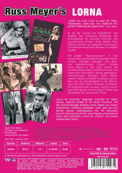 Tauchen Sie ein in die aufregende Welt von Russ Meyer mit der "Lorna - Uncut DVD". Diese besondere Edition, komplett ungekürzt, bietet Ihnen die unverfälschte Vision des legendären Filmemachers Russ Meyer, der für seine provokanten und stilprägenden Werke berühmt ist.
