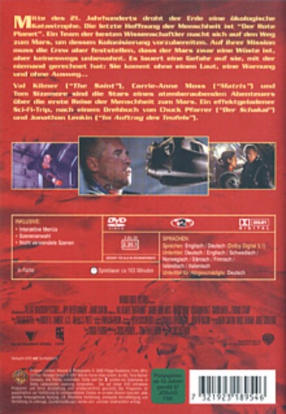 Erleben Sie ein herausragendes Science-Fiction-Erlebnis mit "Red Planet" auf DVD! Tauchen Sie ein in eine packende Geschichte auf dem Mars, wo kein Laut, keine Warnung und kein Ausweg existieren. Der Film, prominent besetzt mit Val Kilmer, Carrie-Anne Moss und Tom Sizemore, nimmt Sie mit auf eine düstere Reise in die Zukunft, in der das Überleben auf einem fremden Planeten zur ultimativen Herausforderung wird. Die beeindruckenden visuellen Effekte und die mitreißende Handlung machen "Red Planet" zu einem Muss für alle Action- und Sci-Fi-Fans. Sichern Sie sich jetzt Ihr Exemplar und entdecken Sie die Geheimnisse des roten Planeten!