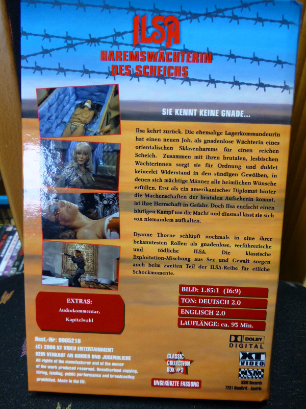 | Extras: | Audiokommentar Originaltrailer deutsch (2:46 Min.) Originaltrailer englisch (3:07 Min.) Alternative Folterszene (2:22 Min.) Trailer: Ilsa - Die Tigerin (2:23 Min.) Trailer: Ilsa - She Wolf of the SS (3:45 Min.) |