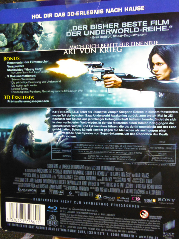 | Bemerkungen: Das FSK-Logo sowie jeglicher Text auf dem Cover (bis auf "Kate Beckinsale" und den Titel des Films auf der Front) befindet sich nicht auf dem Steelbook, sondern auf einer ablösbaren Banderole. Exklusiv bei "Saturn" erhältlich. |