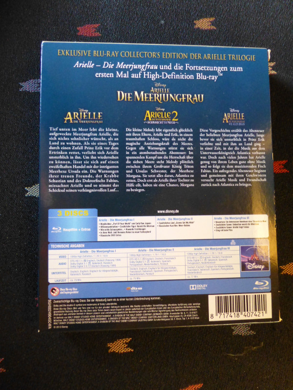 | Bemerkungen: Deutsche Tonspuren: Fassung 1989: Dolby Digital 2.0 Surround Fassung 1998: DTS-HD 7.1 Untertitel Sonstige: "Sing mit beim Film"-Untertitel in den Sprachen Deutsch, Englisch, Italienisch, Russisch 3 Blu-ray-Discs im Mediabook inkl. Schuber mit den Teilen 1-3 Ein 28-seitiges Booklet mit Entwurfszeichnungen ist im Mediabook eingeklebt. FSK-Logo als abziehbarer Sticker |