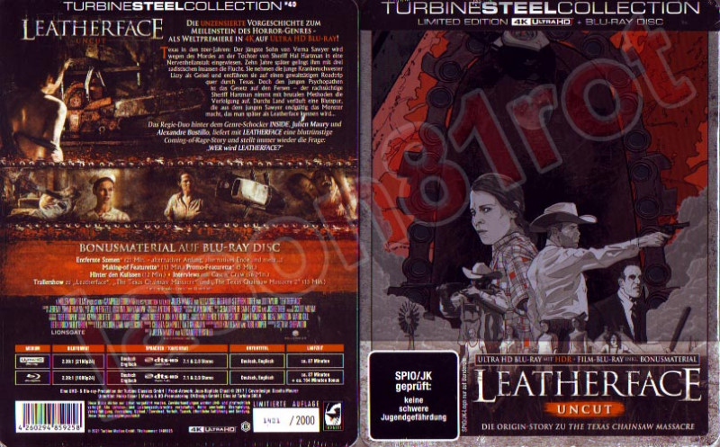 Erleben Sie den ikonischen Horrorfilm wie nie zuvor mit der "Leatherface - Limited 2000 Turbine Steel Collection". Diese exklusive Edition ist ein absolutes Highlight für Sammler und Fans des genresprengenden Horrorfilms. Tauchen Sie ein in die düstere Welt von Leatherface, präsentiert in atemberaubender 4K Ultra HD-Qualität und Blu-ray. Die unzensierte Fassung bringt die rohe und ungeschönte Geschichte direkt in Ihr Wohnzimmer und garantiert ein unvergleichliches Filmerlebnis.