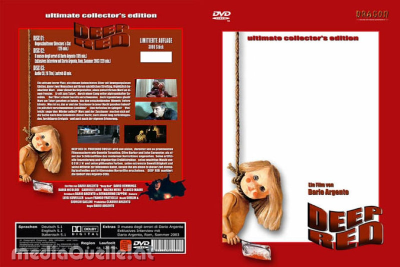 Diese aufwendig gestaltete 3-Disc-Edition liefert Ihnen nicht nur den ikonischen Director’s Cut, sondern auch den englischen Export-Cut des Films sowie eine exklusiv restaurierte italienische Originalfassung. Tauchen Sie ein in die düstere Welt von Deep Red mit atemberaubender Bildqualität und kristallklarem Dolby Digital 5.1 Sound.