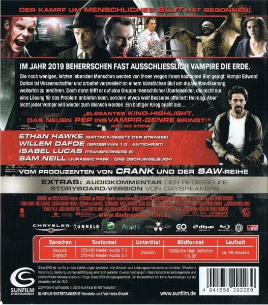 Verpassen Sie nicht diese einzigartige Filmerfahrung, die Spannung, Action und Horror perfekt vereint. Addieren Sie dieses Meisterwerk Ihrer Sammlung hinzu und genießen Sie die düstere Atmosphäre von "Daybreakers" immer wieder aufs Neue!
