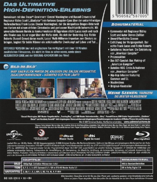 Tauchen Sie ein in die aufregende Welt des organisierten Verbrechens mit der Blu-Ray "American Gangster", einem fesselnden Krimi-Thriller mit den Hollywood-Größen Denzel Washington und Russell Crowe. Diese Extended Edition bietet Ihnen ein außergewöhnliches Heimkinoerlebnis in atemberaubender Bild- und Tonqualität.