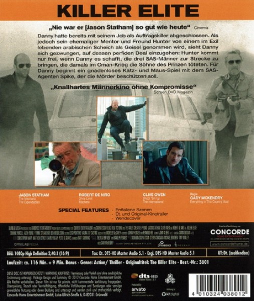 In Killer Elite spielen Statham und Owen zwei der tödlichsten Elitesoldaten der Welt, die in ein spannendes Katz-und-Maus-Spiel verwickelt werden, welches Sie so schnell nicht vergessen werden. Begleiten Sie die Protagonisten auf eine adrenalingeladene Reise durch verschiedene Kontinente, um die gefährlichsten Organisationen der Welt zu bekämpfen. Dabei stellt Robert De Niro in einer weiteren Spitzenleistung seine vielseitigen schauspielerischen Fähigkeiten unter Beweis.