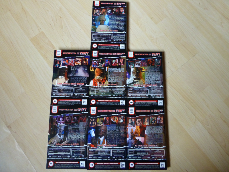 | Bemerkungen: Laufzeit der einzelnen Episoden: 26:20 Min. (Episode 1) Wer zuletzt stirbt 21:59 Min. (Episode 2) Stille Nacht, blutige Nacht 28:03 Min. (Episode 3) Der lebende Tote 27:16 Min. (Episode 4) Schön wie die Sünde 28:35 Min. (Episode 5) Die perfekte Hochzeitsnacht 27:19 Min. (Episode 6) Das Prunkstück der Sammlung Das Intro gibt es nur einmal beim Start der DVD, die Episoden beginnen sofort beim Cryptkeeper. Erschienen in großer Hartbox in CIC-Optik. Limitiert auf 111 Stück. |