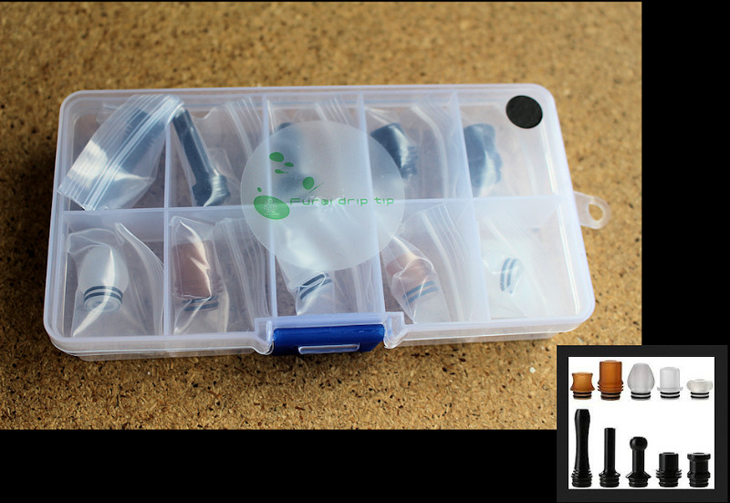 Fural Trip Tip Box von Riccardo, mit 10 verschiedenen 510er Mundstücken aus PVC.