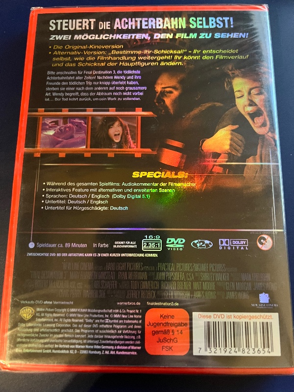 Ob als Geschenk für einen Freund oder zum Ergänzen Ihrer eigenen Filmsammlung – diese ungeschnittene Kinofassung von Final Destination 3 ist ein absolutes Highlight, das in keiner DVD-Sammlung fehlen darf.