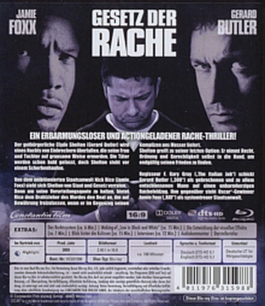 Mit "Gesetz der Rache" auf Blu-ray können Sie die volle Dynamik und Intensität des Films erleben, wie es vom Regisseur beabsichtigt war. Es ist die perfekte Ergänzung für Ihre Sammlung von Krimis und Thrillern, ideal für einen spannenden Filmabend oder um Ihre Heimkinoanlage zu testen. Die starke Performance von Butler und Foxx, kombiniert mit einer geschickt konstruierten Story, macht diesen Film zu einem unvergesslichen Erlebnis.