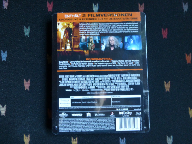 | Bemerkungen: Schwarzes Steelbook mit roter Schrift um Cover und weißer Michael Myers-Abbildung (vorne und hinten). Die J-Card mit dem FSK-Logo auf der Vorderseite und Infos zum Film auf der Rückseite lässt sich leicht ablösen. Inhaltlich identisch mit der Standard-VÖ und enthält die Kinofassung und den Extended Cut auf einer Disc.