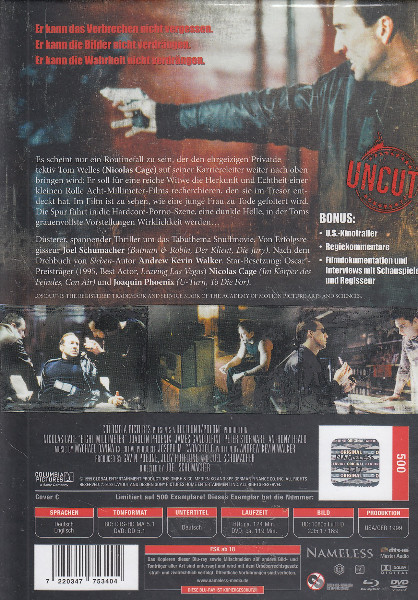 Greifen Sie schnell zu und erweitern Sie Ihre Sammlung mit diesem einzigartigen Mediabook. "8MM Acht Millimeter" bietet Spannung, Nervenkitzel und einen tiefen Einblick in die dunklen Seiten der Menschheit und wird Sie und Ihre Freunde in seinen Bann ziehen.