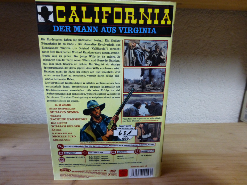 "California - Der Mann aus Virginia" ist ein wahrer Klassiker unter den Westernfilmen, inszeniert von keinem Geringeren als Michele Lupo. Diese limitierte Uncut Edition verspricht puren Filmgenuss in seiner originalen, ungeschnittenen Version – ein Muss für echte Fans des Genres! Das prächtige Cover dieser limitierten Hartbox interpretiert die raue Wildwest-Atmosphäre und lässt jedes Sammlerherz höherschlagen. Mit Giuliano Gemma in der Hauptrolle als tapferer Held aus Virginia sowie weiteren namhaften Darstellern wie Raimund Harmstorf und Miguel Bosé erleben Sie spannende Abenteuer und packende Action. Die hochwertige Verpackung schützt nicht nur den wertvollen Inhalt, sondern macht sich auch hervorragend in jeder Sammlung. Zögern Sie nicht und sichern Sie sich dieses rare Sammlerstück!