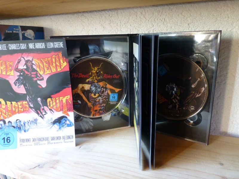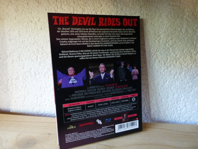 Extras: | Blu-ray 1 Audiokommentar von Christopher Lee, Sarah Lawson und Marcus Hearn Schwarze Magie: Die Entstehung von "Die Braut des Teufels" (34:57 Min.) Britischer Kinotrailer (2:29 Min.) Dennis Wheatley und Hammer (13:13 Min.) US Kinotrailer (2:30 Min.) US TV-Spot (1:01 Min.) Super-8-Fassung (17:32 Min.) Amerikanische Titelsequenz (2:15 Min.) Französischer Werberatschlag (0:40 Min.) Bildergalerie (3:16 Min.) Blu-ray 2 Restaurierte Fassung (96:16 Min.) Audiokommentar von Dr. Rolf Giesen und Uwe Sommerlad Audiokommentar von Dr. Rolf Giesen und Uwe Sommerlad - englische Zusammenfassung (39:07 Min.) Die Kraft des Lichts: Die Restauration von "Die Braut des Teufels" (11:58 Mn.) Restaurierter US Kinotrailer (2:29 Min.) |