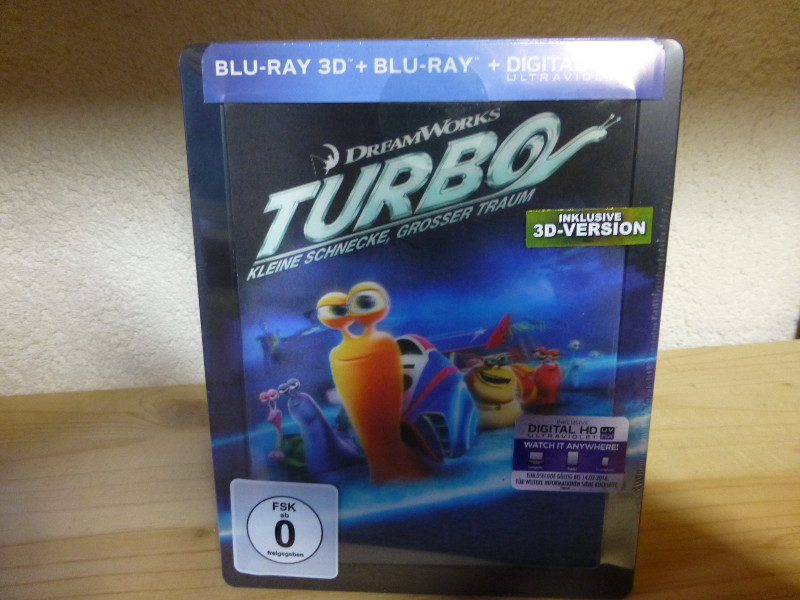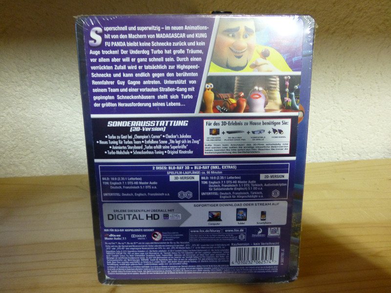 Extras: | Disc 1 (3D Blu Ray DL; 50 GB) + Keine Extras Disc 2 (Blu Ray DL; 50 GB) + Turbo zu Gast bei "Champion''s Corner" (05:00 Min.) + Neues Tuning für Turbo''s Team (02:43 Min.) (Ton: dt., eng., flä., fr., ned.; UT: dt., eng., fr., ned., pol.) + Entfallene Szene - "Tito legt sich ins Zeug" (02:03 Min.) + Animiertes Storyboard - "Turbo erhält seine Superkräfte (02:25 Min.) + Turbo Malschule (60:56 Min.) (auch separat abspielbar) - Einleitung (00:38 Min.) - Turbo (Gartenschnecke) (06:32 Min.) - Turbo (Rennschnecke (03:55 Min.) - Flamme (05:36 Min.) - Checker (06:15 Min.) - Drifter (07:41 Min.) - Bleifuß (07:40 Min.) - Schneller Schatten (08:17 Min.) - Chet (05:12 Min.) - Zeichne deine eigene Rennschnecke (09:43 Min.) (Ton: eng.; UT: dt., eng., fr., ned., pol.) + Checker''s Jukebox (12:47 Min.) (auch separat abspielbar) - Speedin'' (01:52 Min.) - The Snail is fast (01:03 Min.) - Back to Indiana (01:47 Min.) - Jump around (01:23 Min.) - Let the Bass go (03:59 Min.) - Eye of the Tiger (03:02 Min.) (Ton: eng.; kein UT) + Schneckenhaus-Tuning + Original Kinotrailer (02:26 Min.) (eng.) + Vorschau - Turbo Fast (01:14 Min.) (eng.) - Dragons - Die Reiter von Berk (01:03 Min.) (dt.) - Kung Fu Panda - Legenden mit Fell & Fu (00:48 Min.) (dt.) + Die Welt von DreamWorks Animation - Shrek - Der tollkühne Held (01:16 Min.) (eng.) - Madagascar (01:03 Min.) (eng.) - Drachenzähmen leicht gemacht (01:52 Min.) (eng.) - Kung Fu Panda (02:07 Min.) (eng.) - Die Croods (03:38 Min.) (eng.) + 1 Trailer vor dem Hauptmenü - Turbo Fast (01:14 Min.) (eng mit fixen dt. UT) |