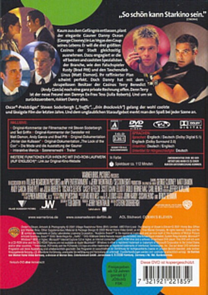 Mit "Ocean's Eleven" holen Sie sich ein Meisterwerk des Kinos nach Hause. Dieser Film, inszeniert von Steven Soderbergh, bietet Spannung pur und exzellente Schauspielkunst. Die hochkarätige Besetzung, darunter George Clooney, Brad Pitt, Matt Damon, Andy Garcia und Julia Roberts sorgt dafür, dass jede Minute ein Genuss ist. Der Film erzählt die packende Geschichte eines ambitionierten Casino-Raubs und kombiniert Action, Intrige und Humor auf brillante Weise. Die DVD bietet außerdem extras wie Interviews und Specials, die einen tiefen Einblick hinter die Kulissen gewähren.