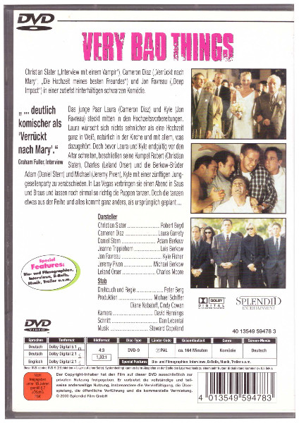 Diese DVD-Version von "Very Bad Things" bietet nicht nur den Film selbst in bester Qualität, sondern auch zusätzliche Features, die das Filmerlebnis noch bereichern. Schauen Sie exklusives Bonusmaterial und tauchen Sie noch tiefer in die Produktion ein. Mit einer Laufzeit von xx Minuten (Laufzeit bitte von den Produktdetails einfügen), bietet diese DVD ein komplettes Unterhaltungspaket für einen gelungenen Filmabend.