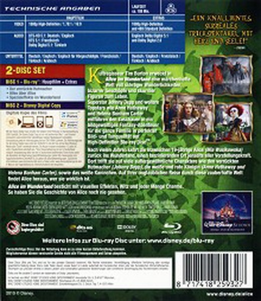 Für Sammler, Filmfans und Liebhaber außergewöhnlicher Fantasiegeschichten ist diese Blu-Ray-Edition ein absolutes Muss. Tim Burtons "Alice im Wunderland" ist ein visuelles Meisterwerk, das durch die hochwertigen Features und die digitale Kopie noch vielseitiger wird. Es ist die perfekte Ergänzung für jede Heimkino-Sammlung und garantiert ein Erlebnis, das man immer wieder genießen möchte.